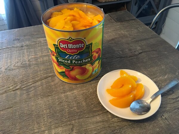 Yummy peaches! I love this size can, I like to open and divide into smaller portions to freeze for later! We make peach cobbler with them!