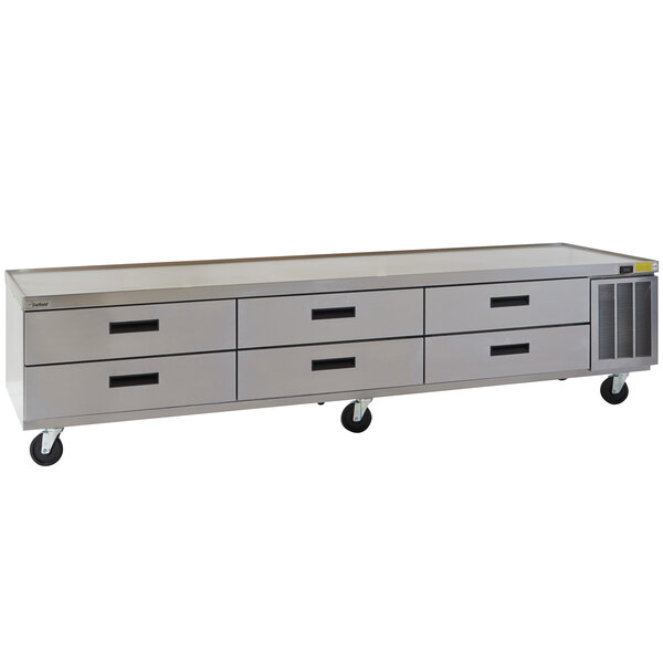 The Delfield F29110CP six drawer 110" refrigerated chef base makes food preparation faster and more convenient by providing both a cooled storage area for temperature sensitive ingredients, and a sturdy base to hold your cooking equipment! Each drawer is 32" wide and can hold two 12" x 20" full size pans up to 4" deep (sold separately). For added convenience, the drawers on this unit are designed to open further than drawers in many standard chef bases. This allows you to lift pans straight up and reduces the risk of spills.