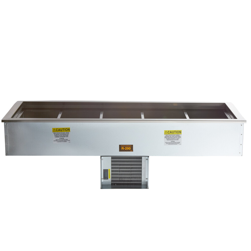 Thanks to its included adapter bars, this cold food well can hold five full size 12" x 20" food pans up to 6" deep at food safe holding temperatures for an extended period of time. It requires a 68" x 25" cutout and a 115V electrical connection for operation.