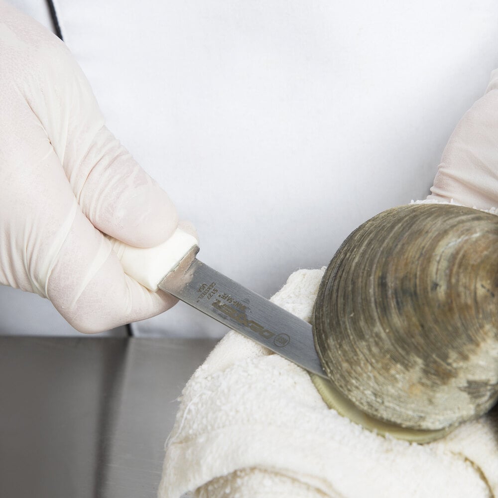 The blade's thin construction makes it easy to cut into small clams, and its rounded tip ensures your safety while in use. When you're ready to shuck, simply hold the knife's edge parallel to the clam's shell opening, push the edge into the seal, cut to the bottom of the shell, and pry it open by twisting the knife.