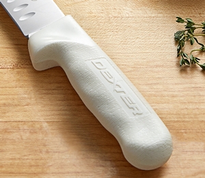 Featuring Dexter-Russell's Sani-Safe textured handle, this knife provides the user with a firm, slip-resistant grip, ensuring safe, accurate cuts. It also boasts an easy-to-clean polypropylene construction to withstand both high and low temperatures up to 250 degrees Fahrenheit. Plus, each piece meets all health code standards with an impervious blade-to-handle seal, making it perfect for use in restaurant and catering kitchens.