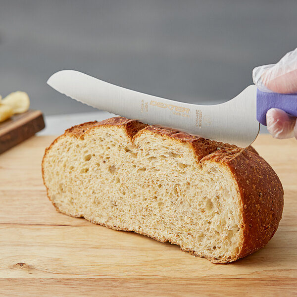 This Dexter-Russell Sani-Safe scalloped bread knife allows you to effortlessly cut through your fresh breads, crusty loaves, and sandwiches without having to worry about flattening or crushing the product. It cuts in long, smooth strokes to minimize crumbling, while its offset handle prevents your knuckles from hitting the cutting area to provide extra leverage for accurate, easy slicing.