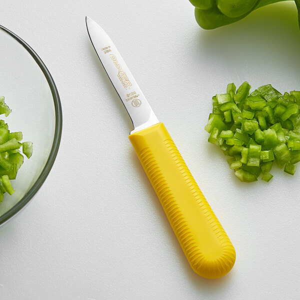 Dexter-Russell 15303G Sani-Safe 3 1/4 “ Green Cook’s style paring knife is great for cutting my small fruit and peeling my potatoes and dicing onion.
