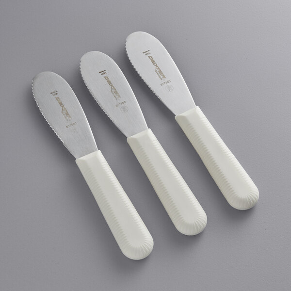 These versatile sandwich spreaders are a time-saving addition to your sandwich shop, buffet, or restaurant. Designed for maximum efficiency, they feature smooth, wide blades, which provide more surface area than a butter knife to make spreading jams, jellies, and other condiments a breeze. Plus, the spreaders' scalloped edges easily cut through the tough rinds of fruits and vegetables without damaging their soft interiors.