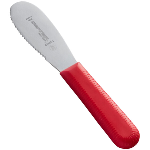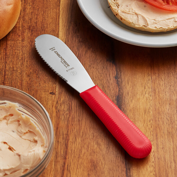 Boasting a comfortable, ergonomic design, this spreader's Sani-Safe handle is textured, slip-resistant, and able to withstand temperatures up to 250 degrees Fahrenheit. Its impenetrable blade-to-handle seal prevents bacteria from becoming trapped for safe, sanitary use and easy cleaning. Plus, its red color makes it a useful tool to integrate in your HACCP system, so you can avoid cross contamination in your kitchen.