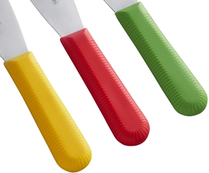 Boasting a comfortable, ergonomic design, these spreaders' Sani-Safe handles are textured, slip-resistant, and able to withstand temperatures up to 250 degrees Fahrenheit. Their impenetrable blade-to-handle seal prevents bacteria from becoming trapped for safe, sanitary use and easy cleaning. Plus, the red, yellow, and green colors make them useful tools to integrate in your HACCP system, so you can avoid cross contamination in your kitchen.