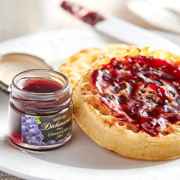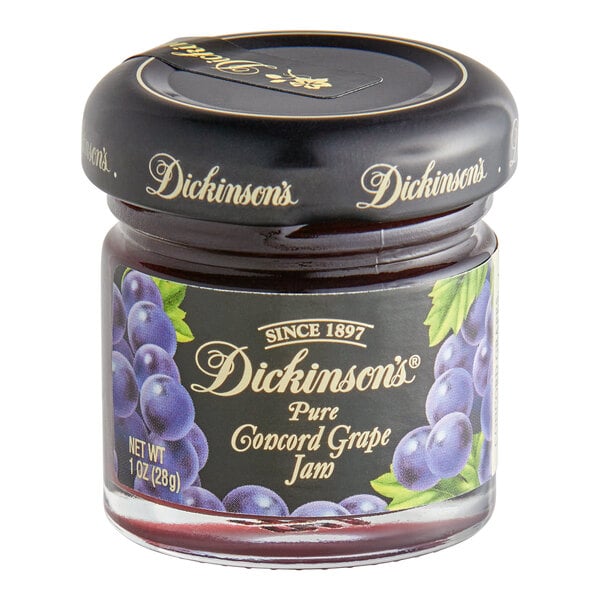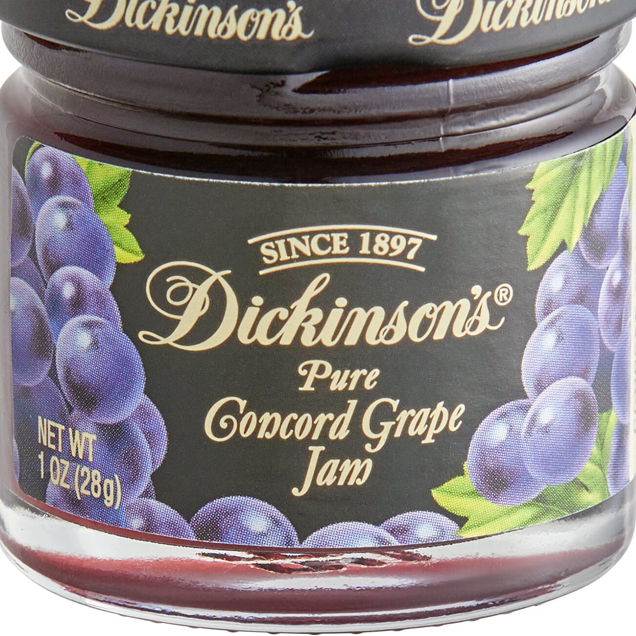 Dickinsons 1 ounce pure Concord grape jam. When delivered will arrive 72 jars in a case box. Concorde grape is one of the most recognized jams. Can be used for peanut butter and jelly sandwiches or combined with butter on toast.