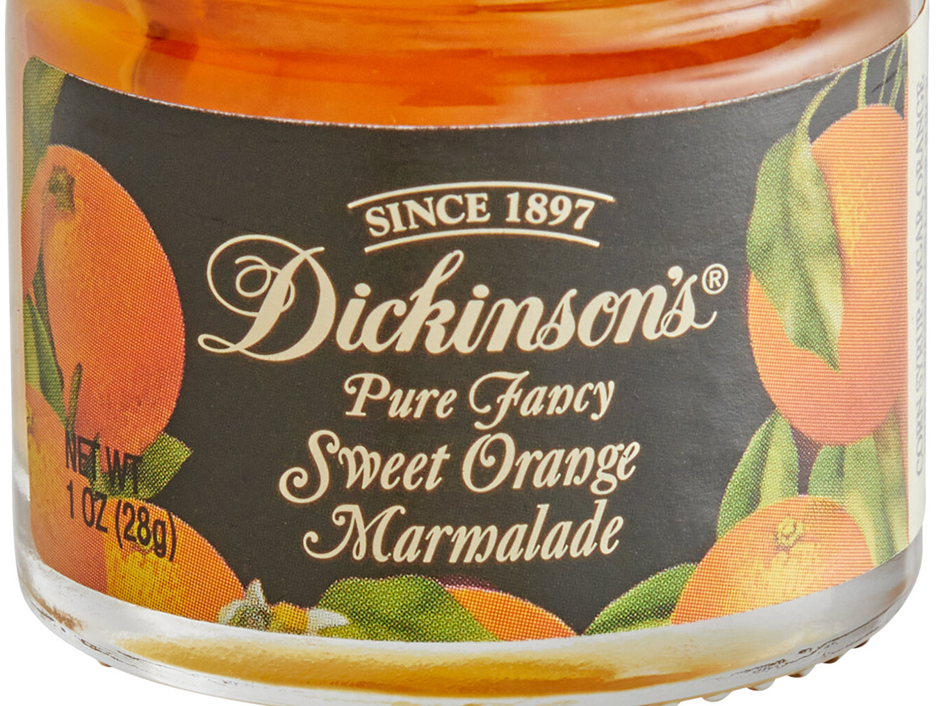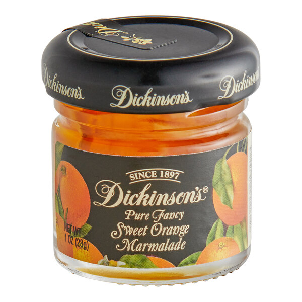 Dickinsons 1 ounce pure fancy sweet orange marmalade. When delivered will arrive 72 jars in a case box. Pure fancy sweet orange marmalade is perfect for either basting ribs and is definitely unique when combined with coconut shrimp.