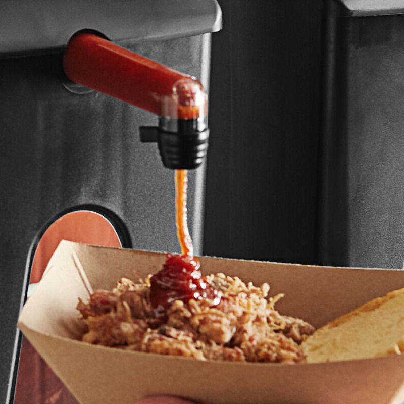 This dispenser is compatible with 0.75, 1, and 1.5 gallon pouched condiments with 16 mm fitments (sold separately) across a wide range of brands, making it a versatile addition to your condiment setup and giving you flexibility in your condiment options. It includes a colorful BBQ sauce decal, adding a touch of visual appeal to your station and making it easy for customers to identify the dispenser's contents.
