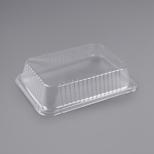 Securely cover and protect your food with this Durable Packaging P6700-100 3" clear dome lid! Designed specifically to fit Durable Packaging 6700-100 14 1/2" x 10 5/8" x 3" foil roast pan, this lid firmly seals around the pan's exterior and prevents spills during transportation or storage. Thanks to its crystal clear plastic material and 3" height, this lid showcases your prepared food and assists with easily identifying different trays.