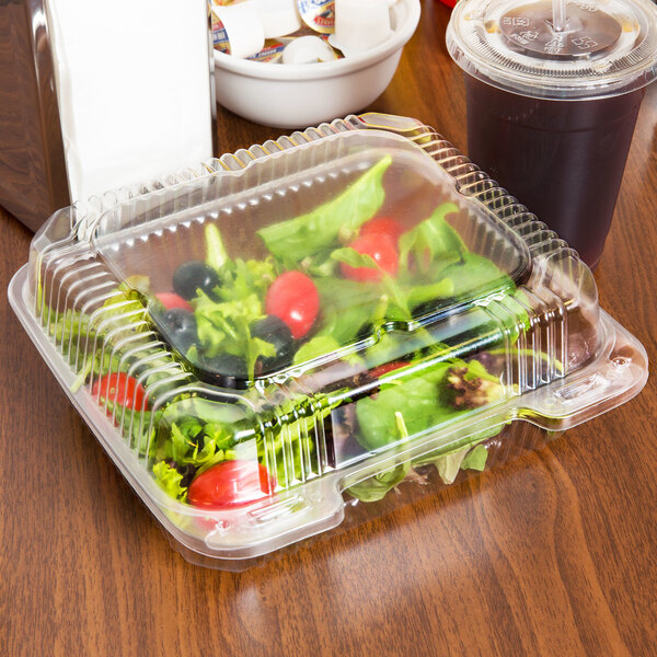 Send desserts, pastries, salads, and specialty sandwiches home with your customers in this Durable Packaging PXT-895 Duralock 8" x 8" one-compartment, clear hinged lid plastic take-out container! The container's crystal clear OPS construction allows customers to immediately identify all of your best take-out offerings. This allows your richly decadent desserts and crisp green salads to effectively market themselves and boost impulse sales. It's also great for packaging up your cookies and other pastries that customers pick out from your display case!