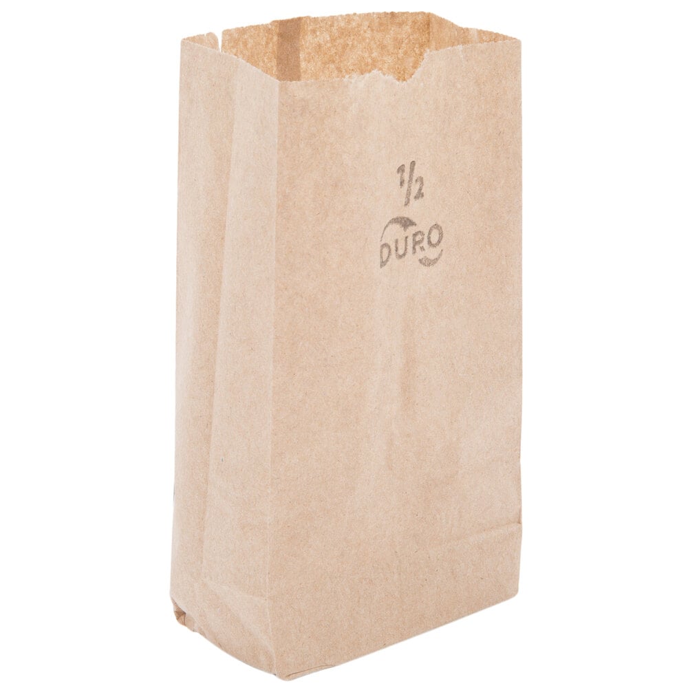 Package deli items, individual beverages, or other small delicacies in this Duro 1/2 lb. natural kraft paper bag. This item features a sturdy 100% recycled paper construction and is made of 60% post-consumer recycled content, combining quality with eco-friendly sustainability. While its small yet versatile size is perfect for lighter products or single-item purchases, its natural color blends in with all styles of decor and can be accessorized to meet your own unique aesthetic.