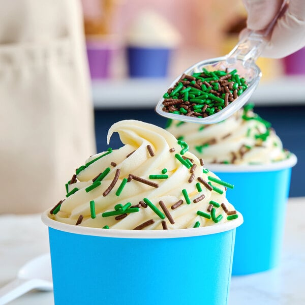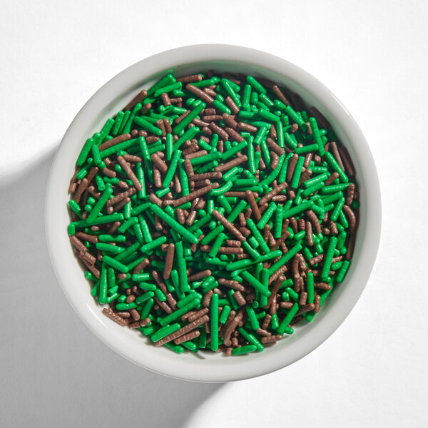 Chocolate mint sprinkles provide a quick and easy way to turn any ordinary menu item into a top-selling specialty item on your menu. Their vibrant colors pop against any backdrop and won't bleed through onto your frostings. Perfect for ice cream parlors, bakeries, and diners, guests will love being able to order these sprinkles as an alternative to traditional rainbow sprinkles.