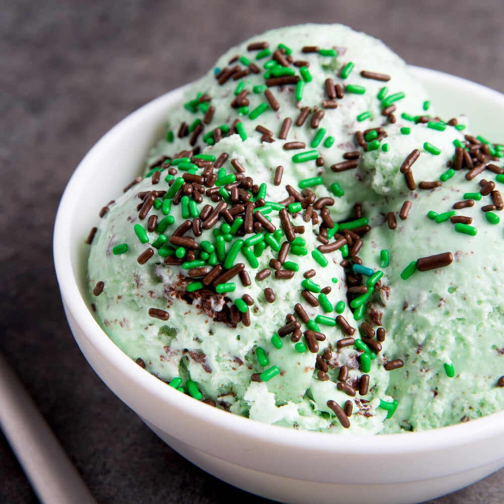 Read More ReviewsChocolate mint sprinkles provide a quick and easy way to turn any ordinary menu item into a top-selling specialty item on your menu. Their vibrant colors pop against any backdrop and won't bleed through onto your frostings. Perfect for ice cream parlors, bakeries, and diners, guests will love being able to order these sprinkles as an alternative to traditional rainbow sprinkles.