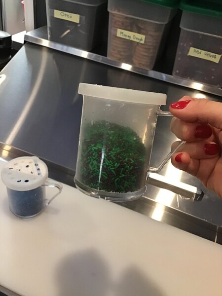 Gun green and black sprinkles that have a great minty taste and flavor. The sprinkles are great for garnishing our dipped waffle cones for a nice treat