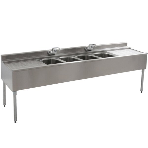 Clean and air-dry your bar's glassware in one convenient location with the Eagle Group B8C-4-22 96" underbar sink! This underbar sink comes with four compartments with 1 1/2" drains and standpipes and a drainboard mounted on either side. Two 10" splash mount faucets with 4" centers make it easy to fill the sinks. The front features a bullnose to prevent glassware from sliding off the edge, and a 4" backsplash protects your walls from splashing water.