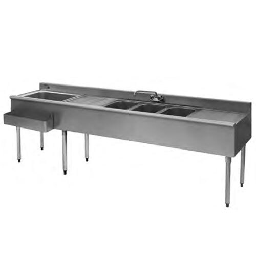 Clean your bar's glassware while keeping a stock of ice ready to use with the Eagle Group BC7C-18L combination underbar sink and ice bin! This combination sink and ice bin features a drainboard on either side and a splash mounted 10" faucet with 4" centers for easy use. Its compartmented top makes it easy to adapt to a three-sink cleaning system, and the top, sink bowls, ice bin, front, and backsplash are made of heavy gauge stainless steel for outstanding durability. Each sink has a 1 1/2" drain with a removable standpipe, and it features a full bullnose front edge.