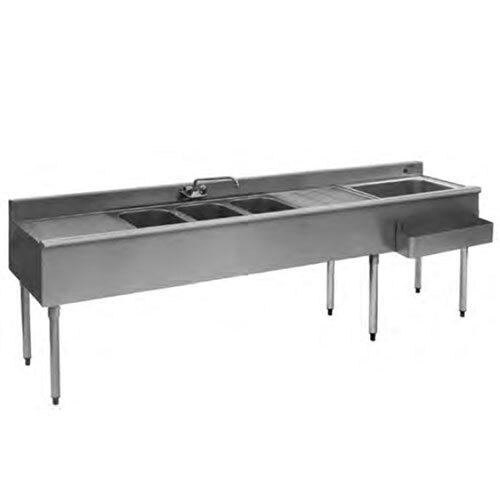 Clean your bar's glassware while keeping a stock of ice ready to use with the Eagle Group BC9C-18R combination underbar sink and ice bin! This combination sink and ice bin features a drainboard on either side and a splash mounted 10" faucet with 4" centers for easy use. Its compartmented top makes it easy to adapt to a three-sink cleaning system, and the top, sink bowls, ice bin, front, and backsplash are made of heavy gauge stainless steel for outstanding durability. Each sink has a 1 1/2" drain with a removable standpipe, and it features a full bullnose front edge.