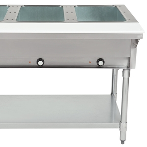 Great for a variety of operations, this electric hot food table includes 3 wells, each of which accommodates a full size food pan (sold separately). The wells are even fully insulated to help retain heat, and the independent infinite controls make operation simple. For operator convenience, this table is outfitted with a cutting board and undershelf. These features provides work and storage space to help promote efficient workflow in the kitchen.