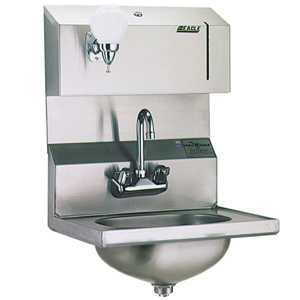 Install a convenient and useful sink in your business with the Eagle Group HSA-10-FDP hand sink! Made of stainless steel, this hand sink features a gooseneck faucet with excellent reach and clearance, and it comes with a convenient overhead towel dispenser for easy hand drying. The soap dispenser is conveniently located for simple use, and thanks to its basket drain, this sink's plumbing is protected against large objects and clogging.