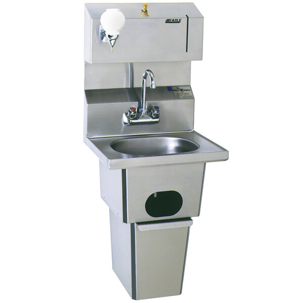 Install a convenient and useful sink in your business with the Eagle Group HSA-10-FDP-T hand sink! Made of stainless steel, this hand sink features a gooseneck faucet with excellent reach and clearance, and it comes with a convenient overhead towel dispenser for easy hand drying. The soap dispenser is designed for simple use, and the built in waste receptacle provides a nearby and easy-to-find area to dispose of paper towels and other refuse without taking up additional space. And thanks to its basket drain, this sink's plumbing is protected against large objects and clogging.