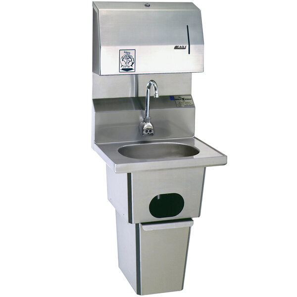 Install a convenient and useful sink in your business with the Eagle Group HSA-10-FDPEE-B-T-MG MICROGARD® hand sink! Made of stainless steel, this hand sink features a MICROGARD® coating to protect it against bacteria and other microorganisms. Its gooseneck faucet provides excellent water flow, reach, and clearance, and the included towel dispenser is conveniently located for easy use. The electronic soap dispenser is designed for simple hands-free activation, and the waste receptacle provides a nearby location for discarded towels. The skirt covers the bottom of the sink bowl and plumbing so to provide a sleek appearance, and thanks to the basket drain, this sink's piping is protected against large objects and clogging.