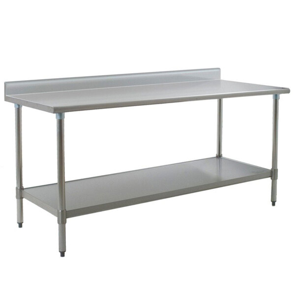 This Eagle Group T2472EB-BS 24" x 72" work table boasts a durable 16 gauge, type 304 stainless steel top that's great for use as a prep area, storage and organization, and a variety of other applications! For added convenience the top is sound-deadened to reduce noise in your work area, while its patented uni-lok recessed gusset design reduces lateral movement for superior stability during use. (4) galvanized 1 5/8" legs with plastic bullet feet provide support for the whole table, and an adjustable galvanized undershelf gives you a place to keep extra supplies close at hand. Plus, this work table has a 4 1/2" rear upturn and 1 1/2" rolled front edge.