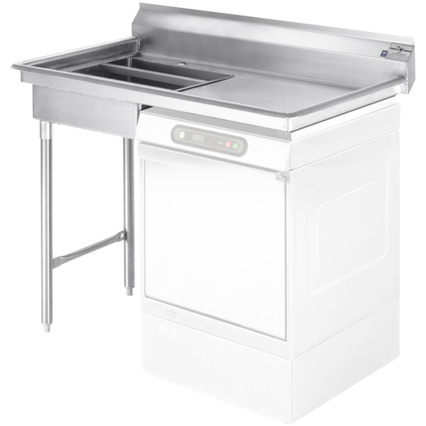 Provide plenty of space to rinse china and glassware, remove scraps, and load warewashing racks by adding this Eagle Group UDT-4R-14/3 48" Spec-Master right side undercounter dishtable to your warewashing system. This table is made of 14 gauge type 304 stainless steel for long-lasting durability. The built-in 20" x 20" x 5" pre-rinse sink is punched for a standard basket drain and it includes a removable crumb cup. Plus, this unit is supplied with a hole for the installation of a pre-rinse faucet (sold separately).