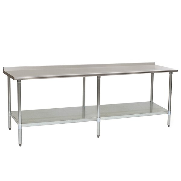 This Eagle Group UT24108SE 24" x 108" work table boasts a durable 14 gauge, type 304 stainless steel top that's great for heavy-duty food prep, butchering, and for use in moist environments! For added convenience the top is sound-deadened to reduce noise in your work area, while its patented uni-lok recessed gusset design reduces lateral movement for superior stability during use. (6) stainless steel 1 5/8" legs with stainless steel bullet feet provide support for the whole table, and an adjustable undershelf made of durable 18 gauge type 304 stainless steel gives you a place to keep extra supplies close at hand. Plus, this work table has a 1 1/2" rear upturn and 1 5/8" rolled front edge.