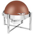 Elevate your contemporary buffet presentation with this Eastern Tabletop 3128MB Pillar'd 8 qt. round black coated stainless steel roll top chafer. This chafer's heavy-duty, 18/10 stainless steel construction and color-infused xylo black coating guarantee a long-lasting, professional look. It's durable yet lightweight enough to provide effortless transportation, set-up, and tear-down. Not only does its sophisticated dome cover help keep food warm and covered to prevent contamination, it also has a brake lock system to prevent it from creating any unnecessary banging upon closing. Once your event is over and your guests have left, the cover is removable for easy cleaning.