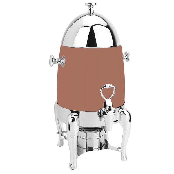 Add a sophisticated touch to your buffet table presentation with this Eastern Tabletop 3131CP Ballerina 1.5 gallon bullet-shaped copper coated stainless steel coffee chafer urn! Featuring a sleek, bullet-shaped design and an elegant copper-coated finish, this urn is perfect for dispensing hot beverages at upscale restaurants, banquets, and receptions. Simply place a can of chafer fuel on the incorporated shelf and light it to keep the chafer's contents warm throughout the length of your event.