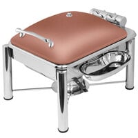 Upgrade the look of your buffet presentation with this Eastern Tabletop 39311GCP Crown 11 qt. stainless steel round induction soup chafer with copper base and hinged glass dome cover. Combining a sophisticated, copper base with a heavy duty 18/10 stainless steel top, this soup chafer lends a sleek, contemporary look and is durable yet lightweight enough to provide effortless transportation, set-up, and tear-down. Not only does its elegant dome cover help keep soups and stews warm, it also prevents dirt, dust, and unwanted particles from contaminating your signature foods. Once your event is over and your guests have left, the hinged cover is removable for easy cleaning.