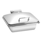 Elevate and enhance the buffet presentation at your hotel, restaurant, or catered event with this Eastern Tabletop Park Avenue square induction chafer. An elegant dome cover is attached with a hinge to keep your food warm and covered at all times. A slowed letdown mechanism locks the lid at any angle, ensuring quiet service as the lid will not bang against the chafer dish upon closure. The design also works to combat cross-contamination by preventing lids from being removed and placed on your table or counter during service. At the end of your meal period, the lid and included food pan are removable for easy cleaning.
