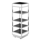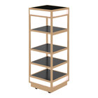 Elevate your buffet presentation with this Eastern Tabletop Q-Bik 4-tier mobile buffet display. Crafted from durable 18/10 stainless steel, this display unit includes four removable and reversible wood laminate shelves that provide an elegant backdrop for showcasing your culinary creations. The xylo black coating not only guarantees a long-lasting, professional look, but it's also antimicrobial and food-safe. The heavy-duty locking casters ensure stability and mobility, making it perfect for both indoor and outdoor use. Additionally, this unit is designed to hold LED lights in the top and bottom acrylic boxes (bulbs sold separately), allowing you to create a captivating ambiance that will impress your guests.
