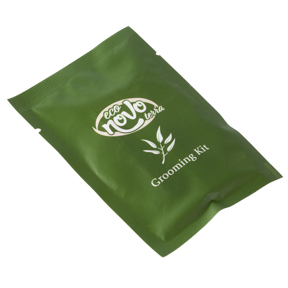 This grooming kit complements the rest of the Novo Terra amenities line, providing a convenient packet of everyday essentials to help care for guests.