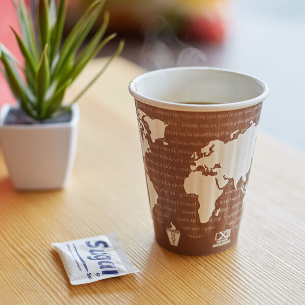 Let your customers know that you care about the environment with this Eco-Products World Art 8 oz. brown insulated hot coffee cup. An ideal alternative to traditional paper hot beverage cups, this cup features a double wall construction that provides heat protection and superior insulation to keep beverages warm over an extended period of time. It's lined with PLA, a plant-based plastic that prevents liquids from soaking through without the environmental impact that comes with petroleum-based plastic linings. Use it to serve your guests their favorite, piping-hot coffees, teas, and lattes.
