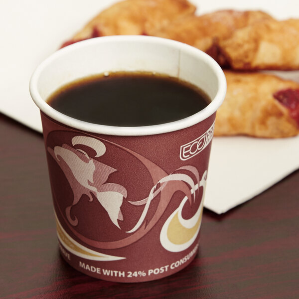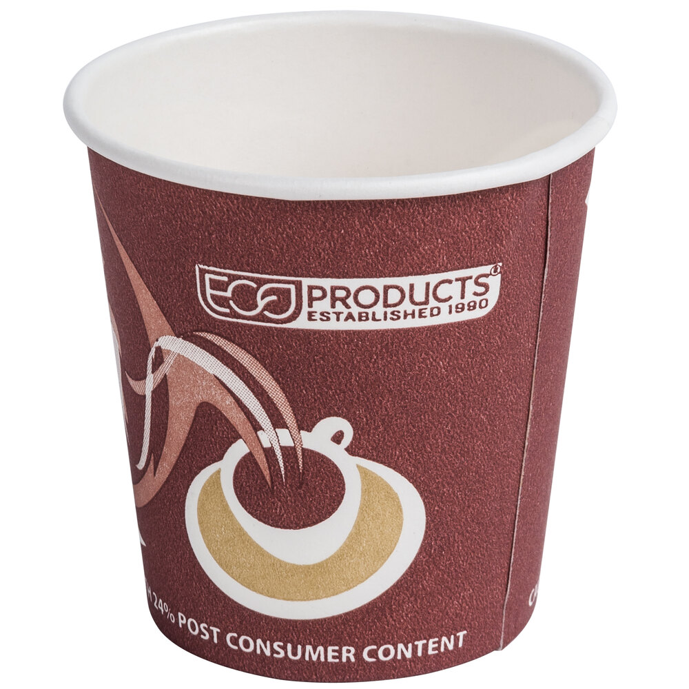 Serve coffee, tea, and cocoa in Eco-Products EP-BRHC4-EW Evolution World PCF 4 oz. hot coffee cups. These high quality, environmentally-friendly products are made with 24% recycled material, keeping waste out of landfills. Each cup features a tightly-rolled rim for leak-proof drinking when used with a compatible lid, and they also have a poly-coated inside to keep the outside of the cup from weakening. Hot cups are perfect for break rooms, coffee shops, and convenience stores.