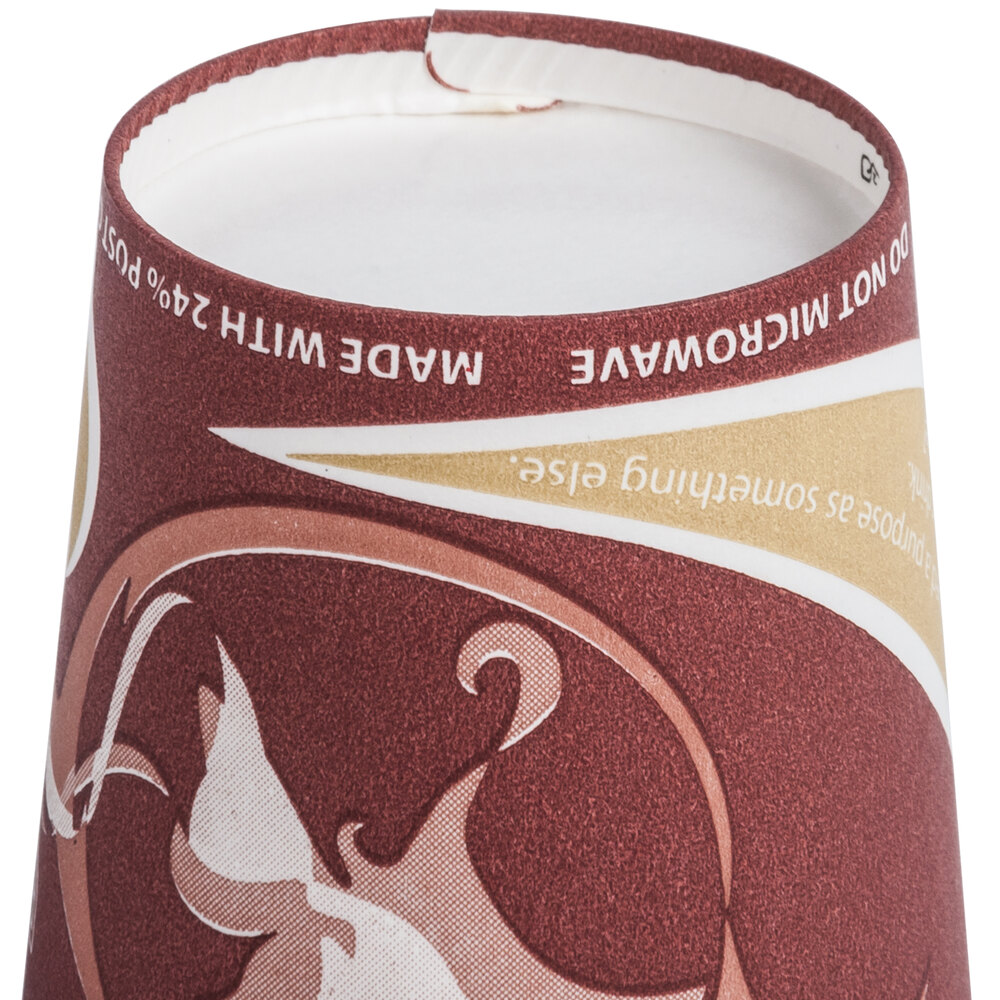 This cup's stylish design features a steaming mug of coffee and a map of the world, which will remind your customers that the cup is eco-friendly. The reddish-brown color of this product also adds to its earthy feel.