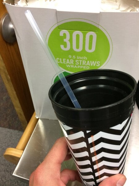 These 9 1/2 inch clear wrapped straws by eco-products are a great alternative to traditional plastic straws. Straws are made from corn and a wrapped in a paper sleeve that says 100% compostable.