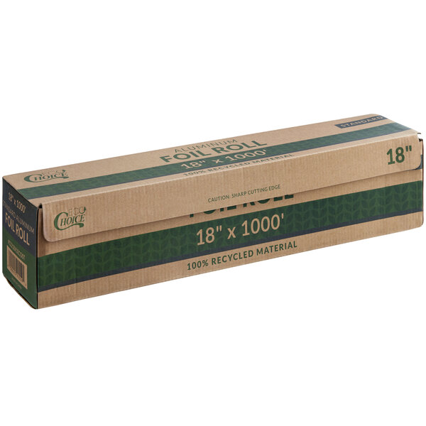 Useful for various food service applications, this standard weight recycled aluminum foil roll can be used for anything from wrapping individual food items to covering foods pans. This 55 gauge aluminum foil roll is an affordable way to meet all of your cooking and storing needs. Packaged in a convenient cutter-box dispenser, this foil is perfect for commercial kitchen use. Quickly and easily pull out the desired amount of foil and tear it off by gently pulling down across the teeth of the blade.