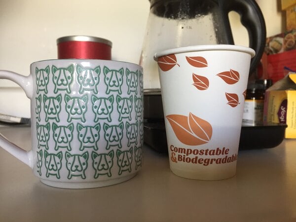 We use these for the time being because there is not currently a home compostable coffee cup. These types have to be taken to a facility to be disposed of properly/in an eco-friendly way. For now they are okay.