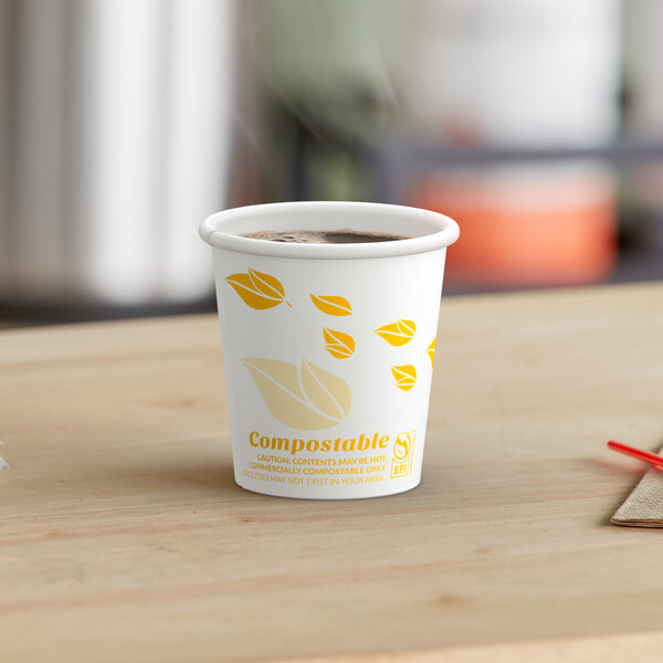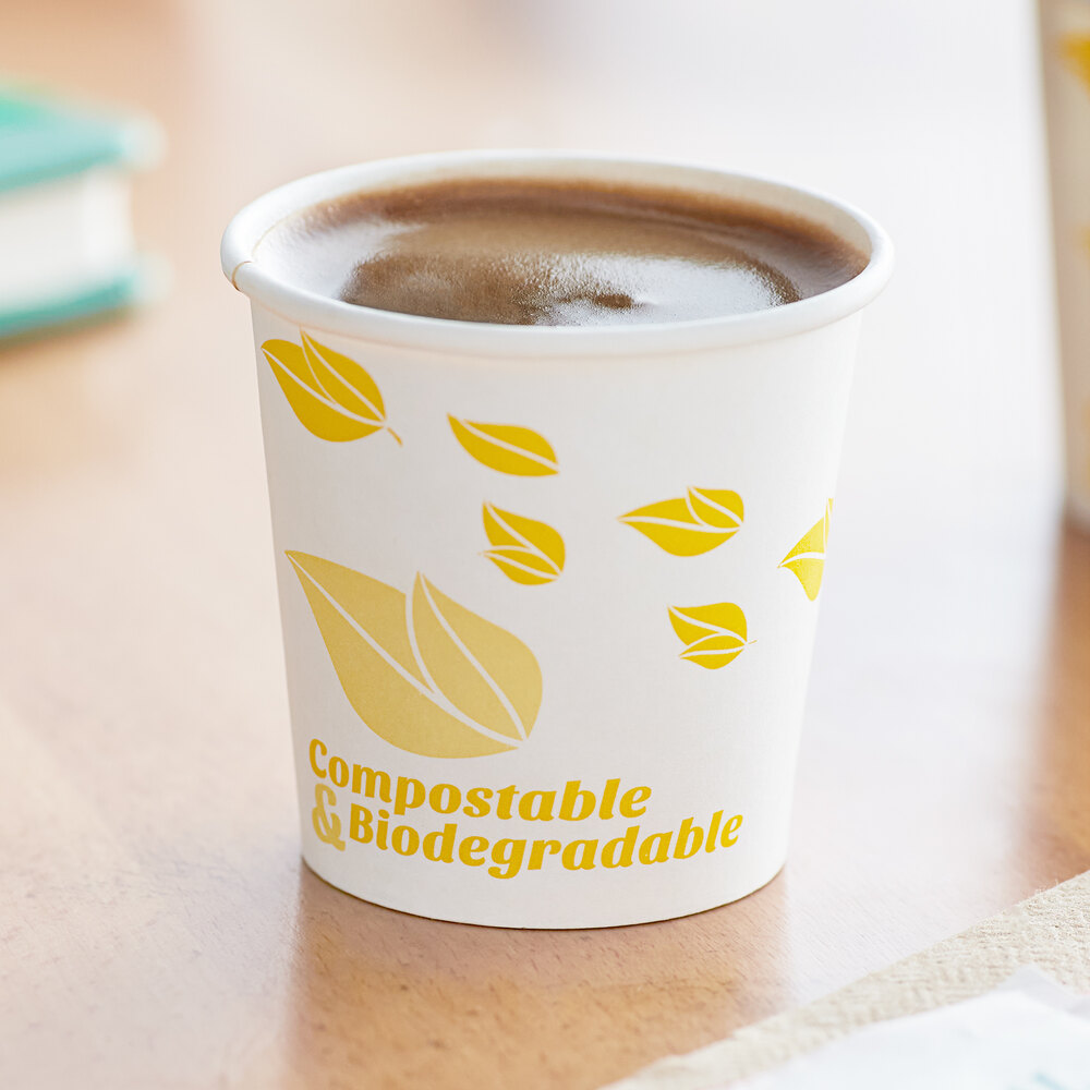 We use these for the time being because there is not currently a home compostable coffee cup. These types have to be taken to a facility to be disposed of properly/in an eco-friendly way. For now they are okay.