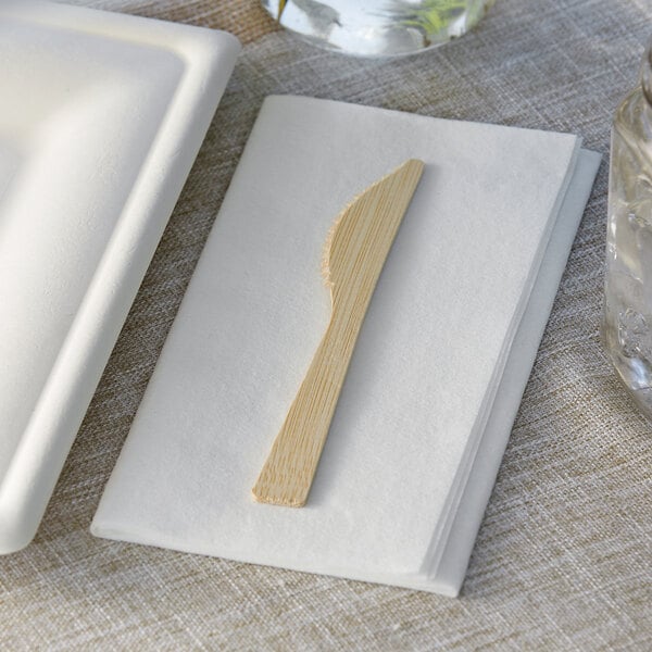 Offer your guests an environmentally friendly utensil with this EcoChoice 6 1/2" compostable bamboo knife. Crafted from renewable bamboo, this knife is an eco-conscious alternative to plastic utensils, showcasing your commitment to sustainability. It's conveniently disposable for quick and easy cleanup and is also commercially compostable (check for available facilities in your area).