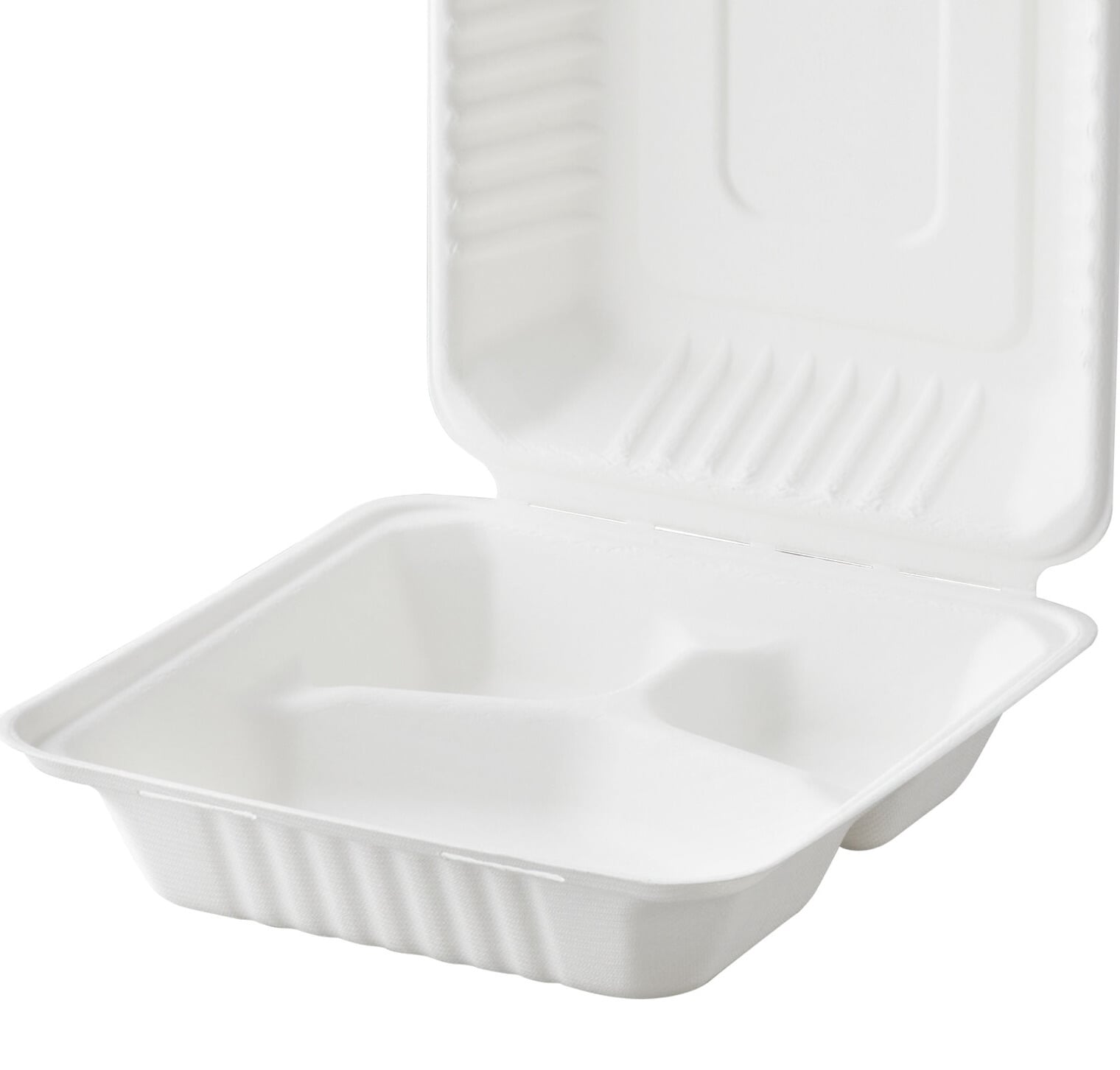 The EcoChoice 8" x 8" x 3" compostable white plant fiber 3 compartment take-out container is perfect for restaurants, caterers, and sandwich shops that serve anything from hot entrees to cold salads. Package up takeout orders or leftovers for your customers while also taking a step toward going green with this environmentally smart option!