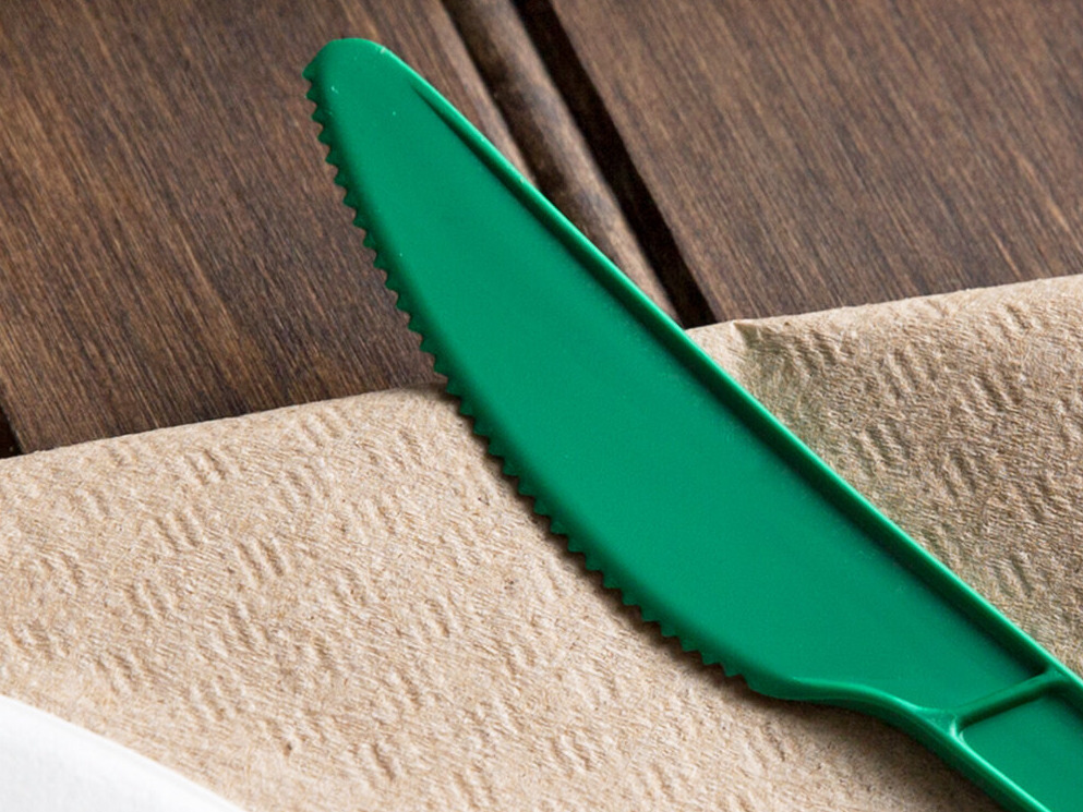 An ideal alternative to traditional, petroleum-based plastic utensils, this knife is made of CPLA, a plant- and chalk-based plastic that's formed with renewable resources to minimize environmental impact upon disposal.