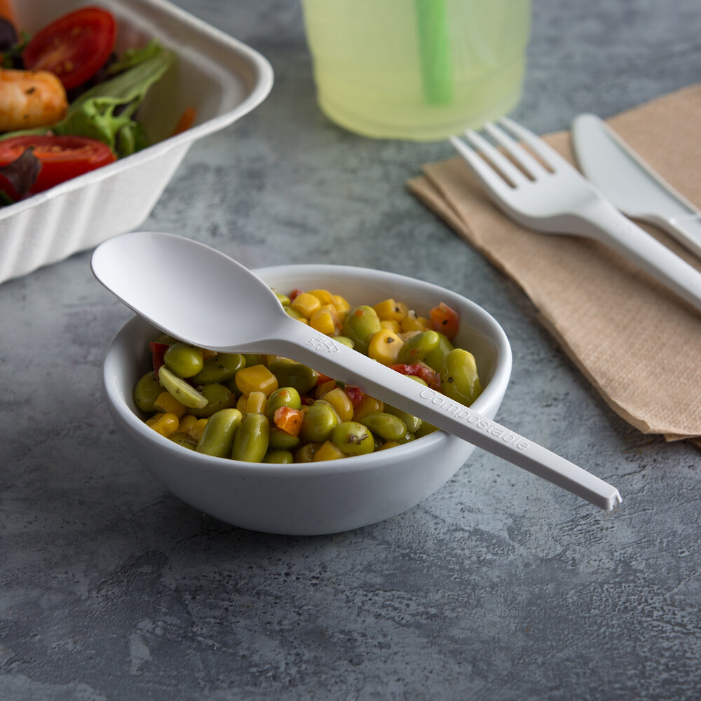 Show your guests that your establishment cares about the environment and about supplying excellent products by providing them with this disposable CPLA spoon! The word "compostable" is even stamped on the handle of this utensil so guests can recognize your eco-friendly choices.
