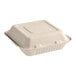 Choose an eco-friendly solution for your take-out needs with this EcoChoice 9" x 9" x 3" no PFAS added natural plant fiber 3-compartment take-out container! With the ample size, this take-out container is the perfect fit for serving full entrees. The 3-compartment design is great for serving sides along with the entree and keeping dishes separate. With an attractive natural appearance, this clamshell container creates a clean and neutral look that pairs great with any branding.