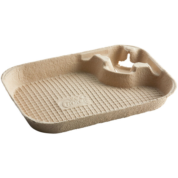 A great eco-friendly choice for your business, this carrier with tray is made from rough molded fiber and 100% recycled material. Your customers can place an 8 to 32 oz. cup with a pedestal base in the cup holder. The ample tray section is ideal for holding hamburgers, hot dogs, french fries, baked goods, and sandwiches. For optimal usage, be sure to first place a layer of deli paper on the tray section before putting food on it.