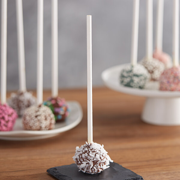 This cake pop straw makes it easy to serve and display your intricately decorated cake pops. Use it at your trendy bakery, everyday concession stand, or catered events. The durable paper construction ensures a sturdy base for your cake pops, no matter where it's used. The sturdy straw will hold the weight of lofty cake pops in cake pop "bouquets" at wedding receptions or fresh fruit "bouquets" for special occasions. With this cake pop straw, you'll be able to create one-of-a-kind designs that your customers will appreciate long after your event is over.
