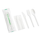 Offering a more sustainable option for disposable cutlery, these EcoChoice wrapped kits include a heavy weight 6 1/2" black knife, fork, spoon, and napkin. An ideal alternative to traditional, petroleum-based plastic utensils, the cutlery is BPI certified and made of CPLA (crystalized polylactic acid), a plant- and chalk-based plastic that's formed with renewable resources to minimize environmental impact upon disposal.